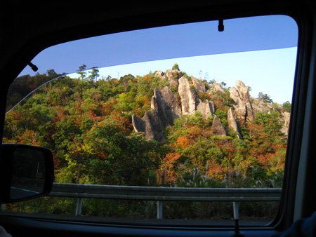 車窓から岩肌からのぞく赤や黄色の紅葉が綺麗でした、