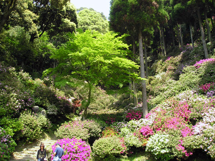 山の傾斜につつじがびっしりと、、、日陰のつつじはまだ蕾も多し