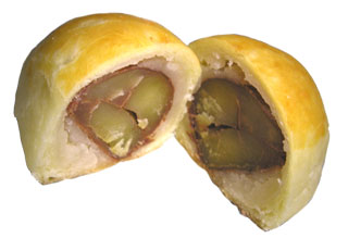 やわらかくシロップ漬けした渋皮栗をパイ生地で包んで焼いたもの