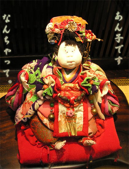 あん子ちゃん、そっくり人形は「かさのや」さんのウィンドウでご覧ください