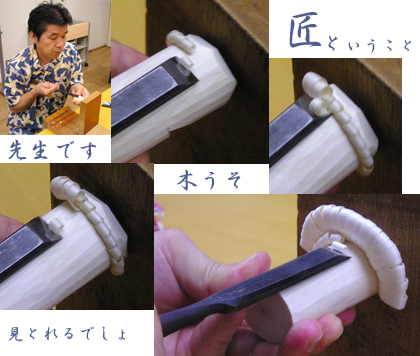 先生が「木うそ」の作り方のデモンストレーションを見せてもらいます