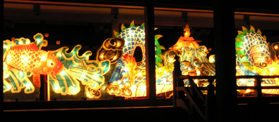 小道には、ロウソクの炎がゆらめく行灯が道案内をしてくれます